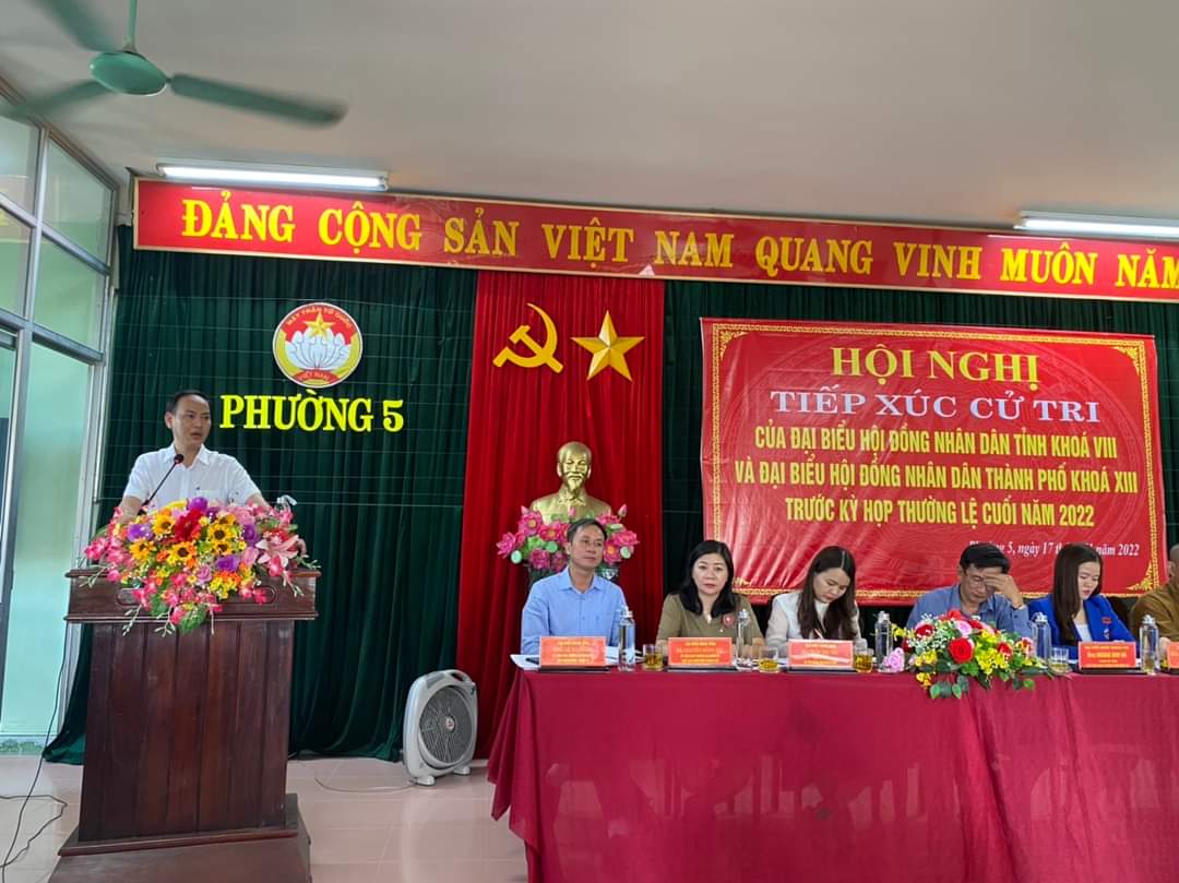 Tại hội nghị tiếp xúc cử tri có các ý kiến bà con cử tri tham gia phát biểu, kiến nghị, đề xuất trên các mặt đô thị, GPMB, chính sách.... tại buổi tiếp xúc cử tri đoàn đại biểu HĐND tỉnh, đại biểu HĐND thành phố, lãnh đạo phường đã có phát biểu trao đổi, giải trình và được cử tri đồng tình, ủng hộ. Hội nghị tiếp xúc cử tri tại địa bàn Phường 5 thành công tốt đẹp.