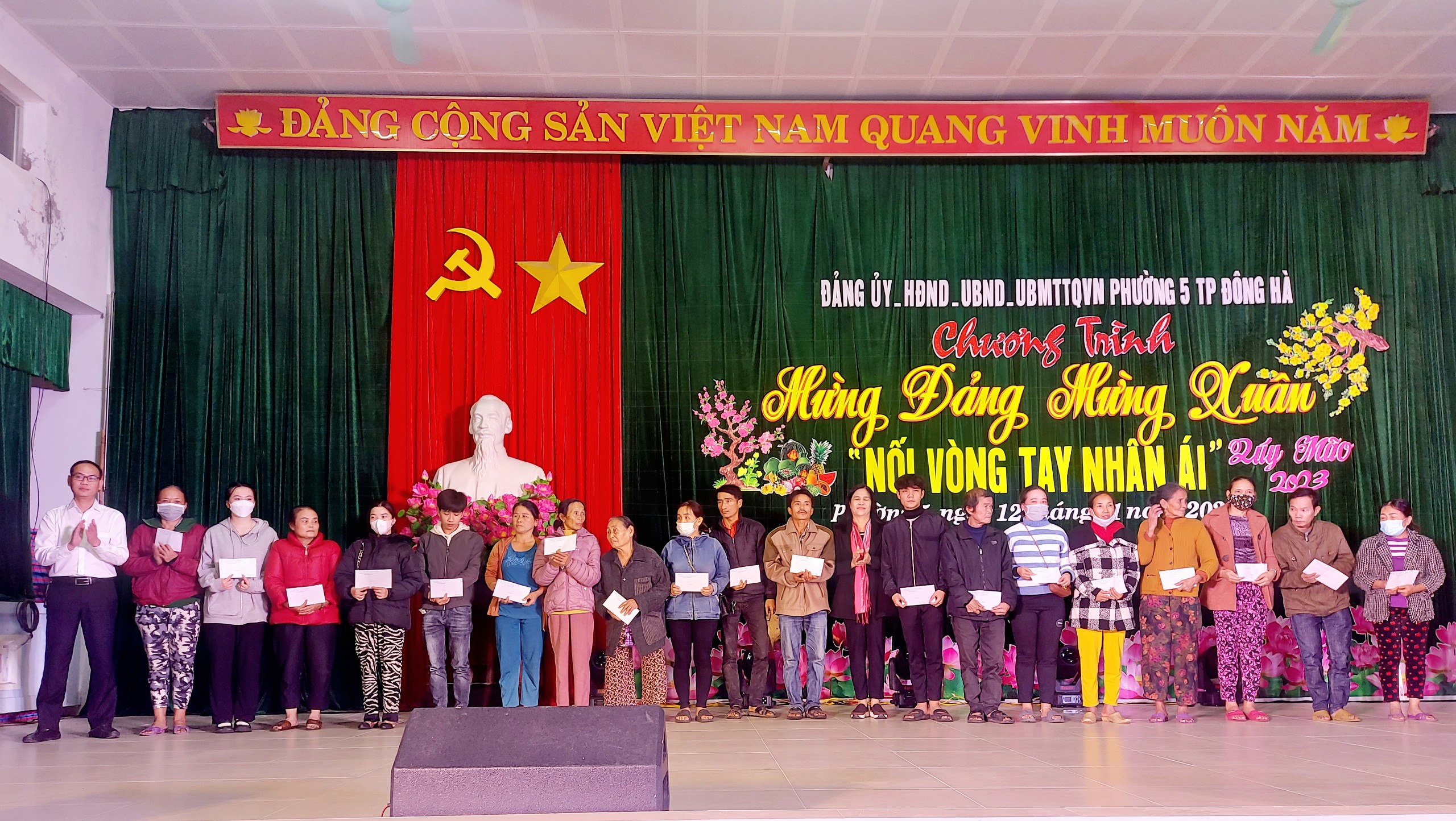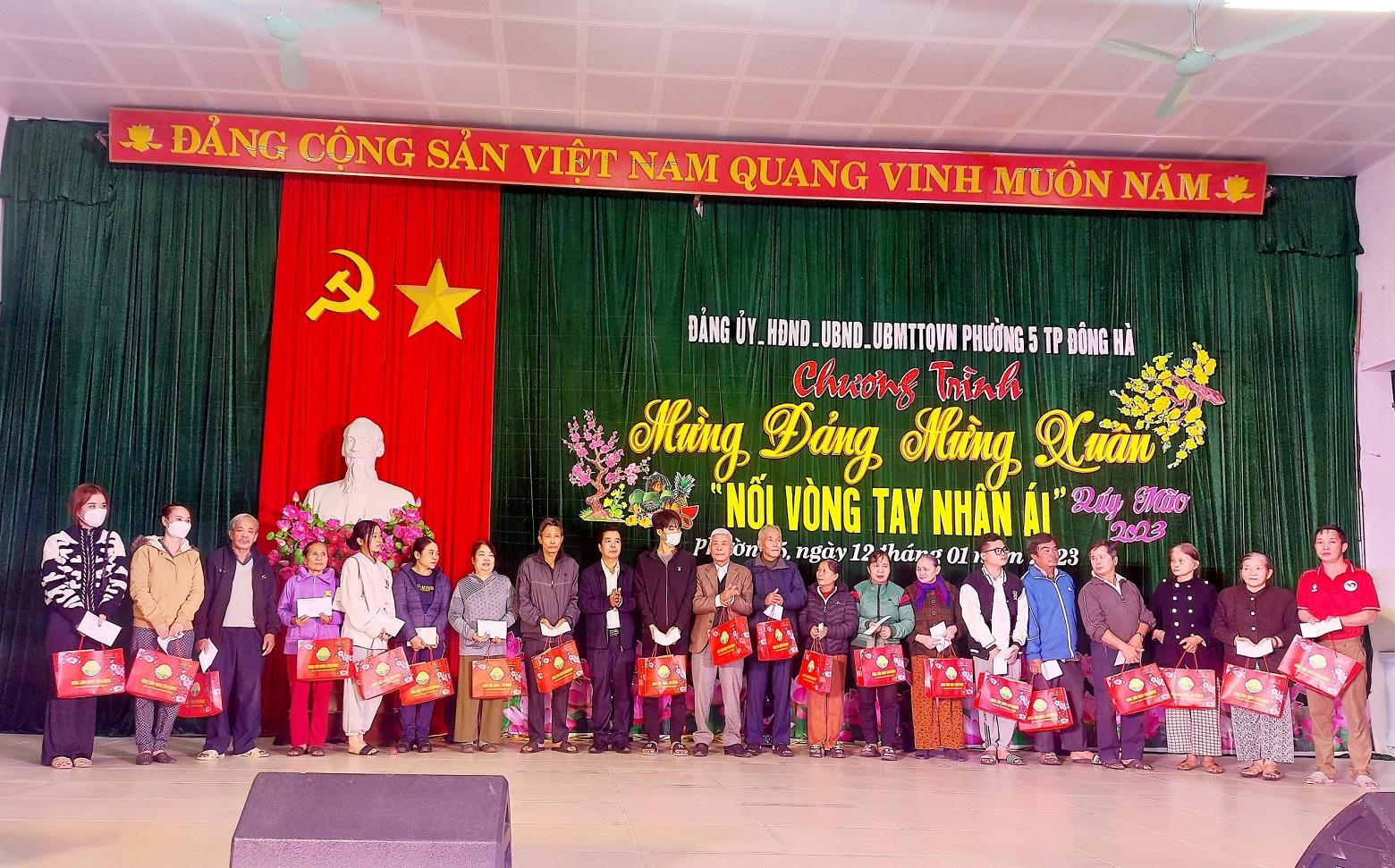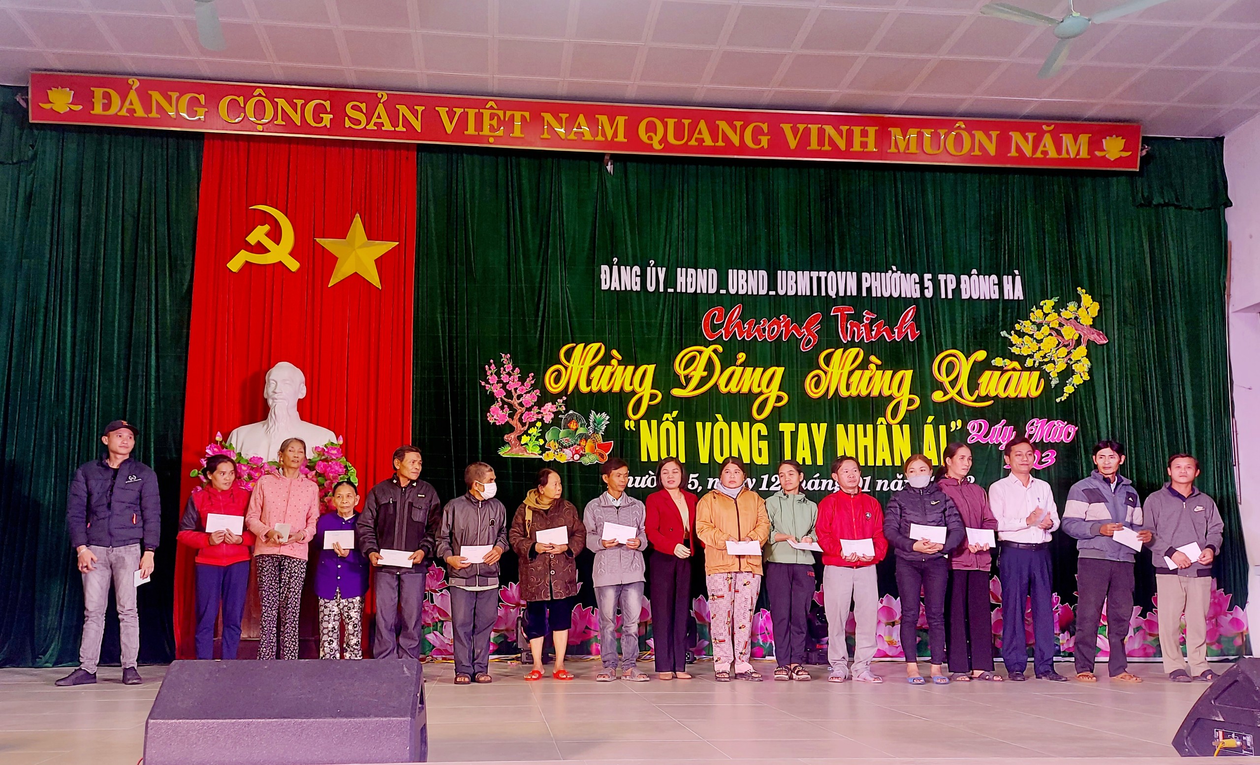 Nhằm thiết thực chào mừng kỷ niệm 93 năm ngày thành lập Đảng 3/2 và đón Tết Nguyên đán Quí Mão 2023, tạo không khí đón xuân mới vui tươi, phấn khởi trong Nhân dân, Tối ngày 12/1, Đảng ủy, HĐND, UBND, Ủy ban MTTQ Phường 5 tổ chức chương trình “ Mừng Đảng, mừng xuân – Nối vòng tay nhân ái”. Tham dự chương trình có ông Lê Tiến Dũng, TUV, Giám đốc sở Công thương tỉnh Quảng Trị, bà Nguyễn Thị Thanh Hương, UVBTV Thành ủy, Trưởng ban dân vận Thành ủy, ông Nguyễn Sỹ Trong, Phó Chủ tịch UBND thành phố.