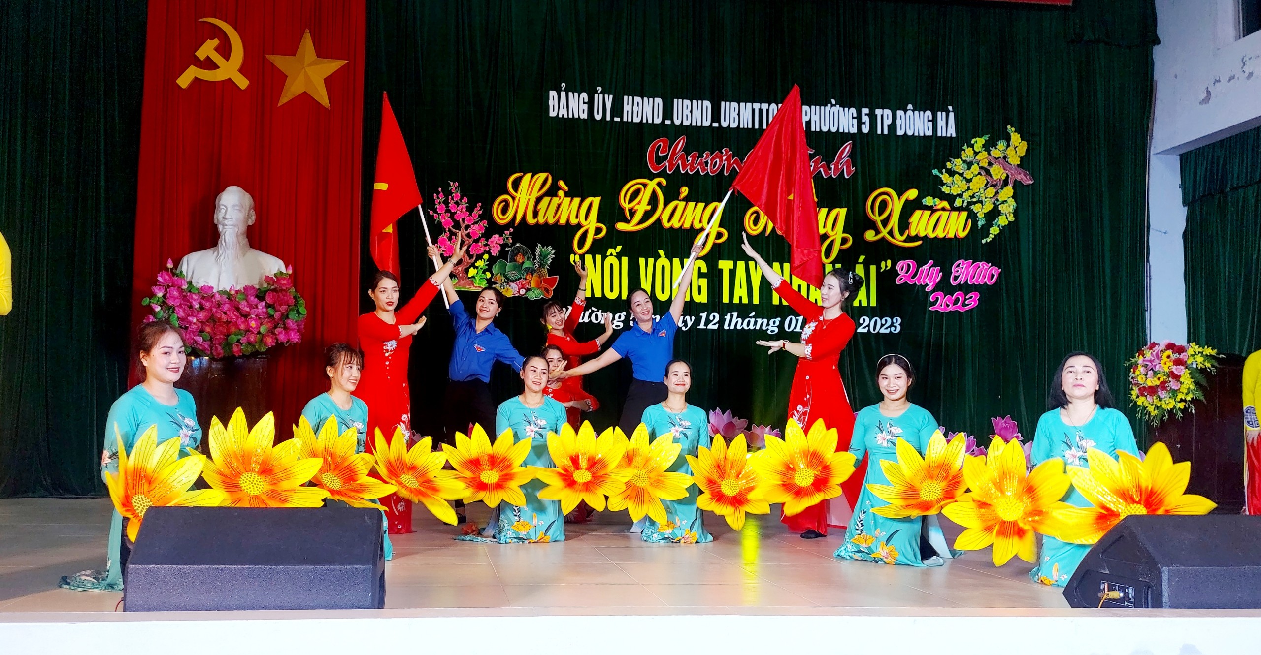 Mở đầu chương trình nghệ thuật gồm các tiết mục văn nghệ đặc sắc với chủ đề “mừng Đảng - mừng Xuân, Nối vòng tay nhân ái” như một món quà Tết ấm áp dành tặng cho tất cả Nhân dân trên địa bàn Phường 5. Các bài hát, điệu múa được ca ngợi về Đảng cộng sản Việt Nam quang vinh, Bác Hồ kính yêu và hát về mùa xuân rất sôi động.