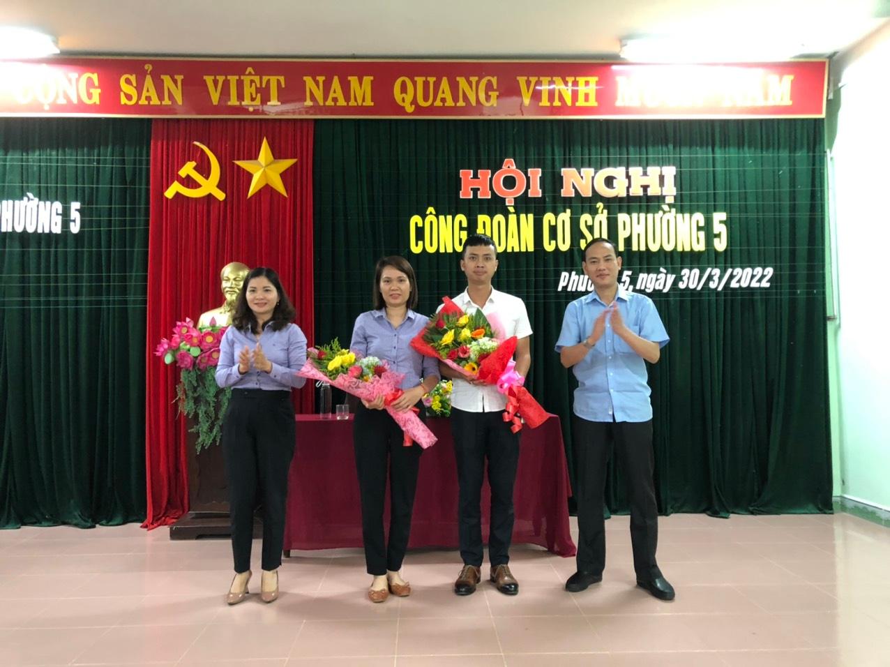 Ngày 30/3/2022, Công đoàn cơ sở Phường 5 đã tổ chức Hội nghị Công đoàn cơ sở bầu bổ sung Ban chấp hành Công đoàn. Theo đó, Hội nghị đã bầu bổ sung 02 đồng chí vào BCH Công đoàn (Đồng chí Diêu Thị Kim Ngọc -PCT UBND và đồng chí Nguyễn Sỹ Đạt - Phó CHT Quân sự - Phó Bí thư Đoàn phường), kết quả bỏ phiếu 21/21 phiếu đạt tỷ lệ 100% số đoàn viên tham gia. Đồng thời Ban chấp hành Công đoàn cũng đã tiến hành bầu chức danh Chủ tịch Công đoàn đối với đồng chí Diêu Thị Kim Ngọc - PCT UBND với số phiếu 3/3 đạt tỷ lệ 100%.