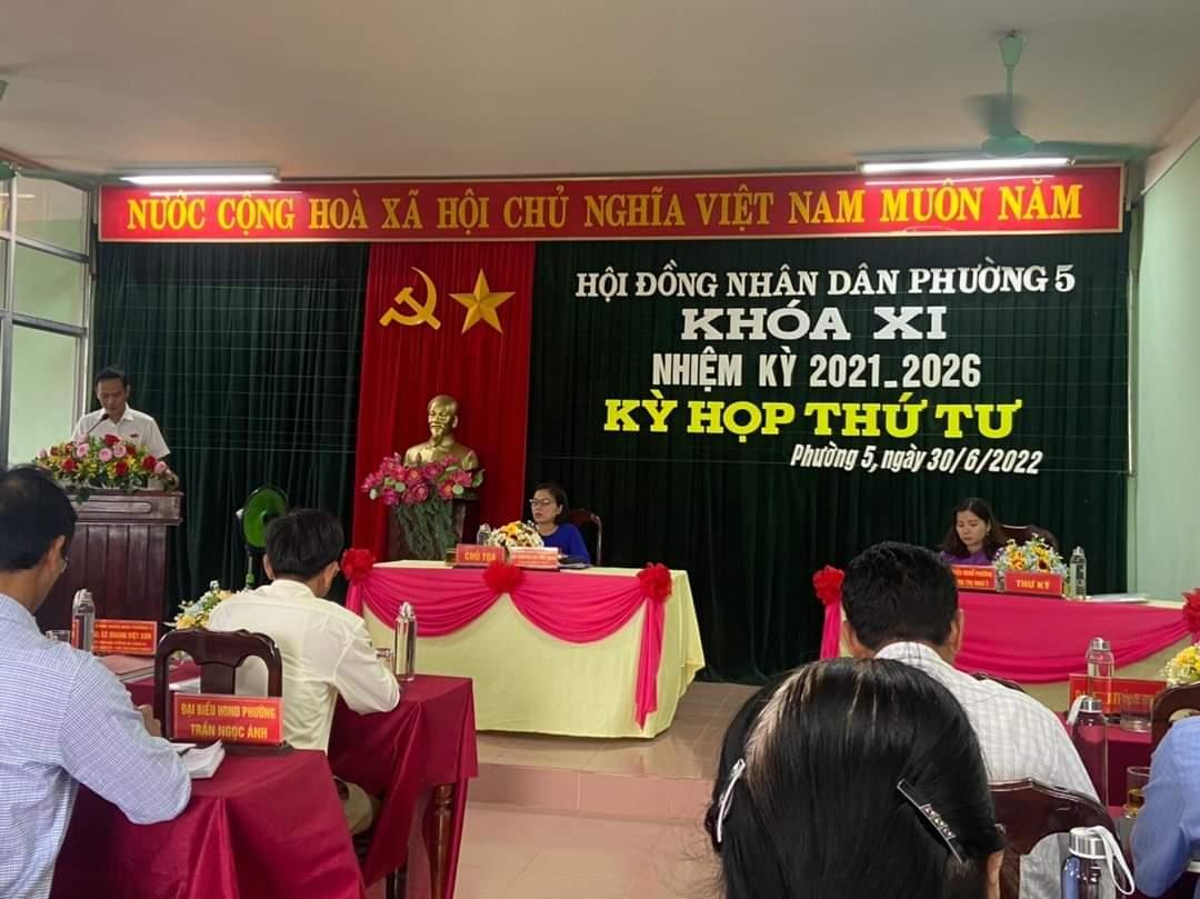 Sáng ngày 30/6/2022, HĐND Phường 5 tổ chức kỳ họp thứ Tư; Tham dự kỳ họp về phía thành phố có ông Hoàng Kim Hà- ThUV, Chủ tịch Liên đoàn lao động Thành phố - đại biểu HĐND thành phố bầu tại khu vực Phường 5, về phía phường có ông Lê Quang Việt Sơn - UVBTV Thành ủy, Bí thư Đảng ủy, Chủ tịch UBND phường, cùng các ông, bà trong BTV Đảng ủy, Thường trực HĐND, UBND, UBMTTQVN và các ban ngành liên quan thuộc UBND phường, đại diện các ngành, đoàn thể phường, Đại biểu HĐND phường khóa XI; Các Bí thư chi bộ, khu phố trưởng, trưởng ban Công tác mặt trận 11 khu phố.
