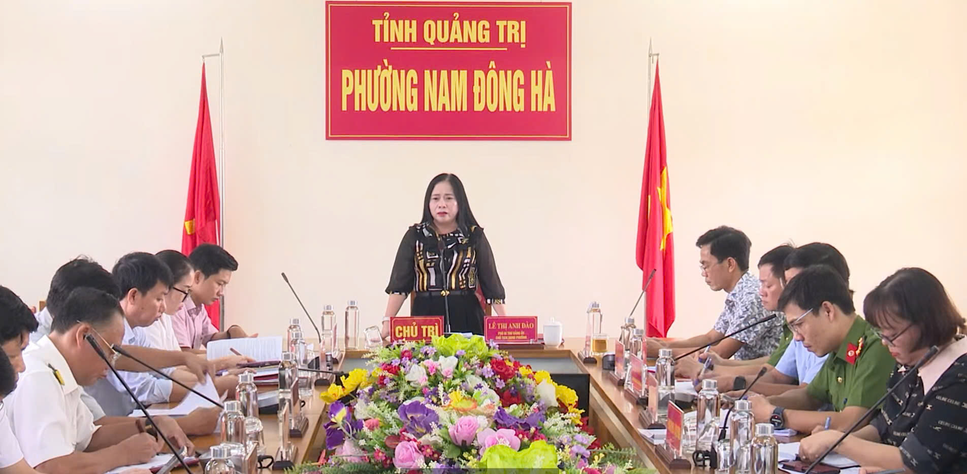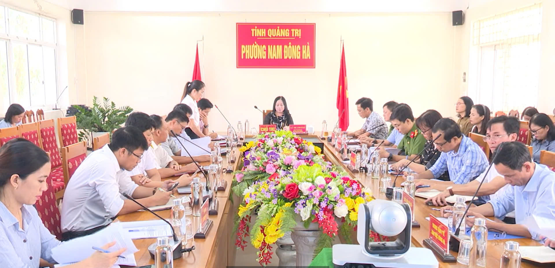 Cuộc họp do đồng chí Lê Thị Anh Đào - Phó Bí thư Đảng ủy, Chủ tịch UBND phường, Trưởng Ban Chỉ đạo - chủ trì. Tham dự cuộc họp có các đồng chí: Trương Văn Tuân - Phó Chủ tịch UBND phường, Phó Trưởng ban thường trực; Nguyễn Việt Hùng - Phó Chủ tịch UBND phường, Phó Trưởng ban; Trần Nam Trung - Trưởng Công an phường; Nguyễn Thị Thùy Vân - Trưởng phòng Văn hóa - Xã hội cùng các thành viên Ban Chỉ đạo theo Quyết định số 1106/QĐ-UBND ngày 19/8/2025, các Tổ công tác giúp việc (Quyết định số 01/QĐ-BCĐ và 02/QĐ-UBND ngày 15/9/2025), và đại diện các đơn vị phối hợp như: Cục Thuế cơ sở 2 tỉnh Quảng Trị, BHXH Cam Lộ, Trung tâm Y tế khu vực Đông Hà, Viettel Quảng Trị, Mobifone Quảng Trị.