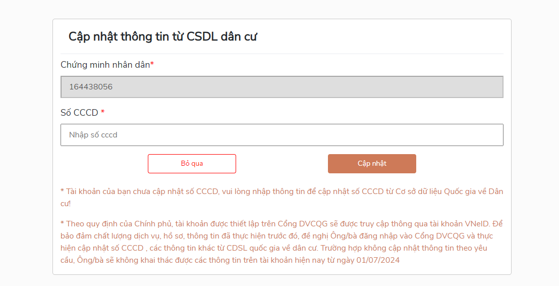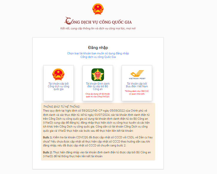 Theo quy định của Chính phủ, tài khoản được thiết lập trên Cổng DVCQG sẽ được truy cập thông qua tài khoản VNeID. Để bảo đảm chất lượng dịch vụ, hồ sơ, thông tin đã thực hiện trước đó, công dân/cán bộ cần thực hiện cập nhật số CCCD. Trường hợp không cập nhật thông tin theo yêu cầu, công dân/cán bộ sẽ không khai thác được các thông tin trên tài khoản trước đây.