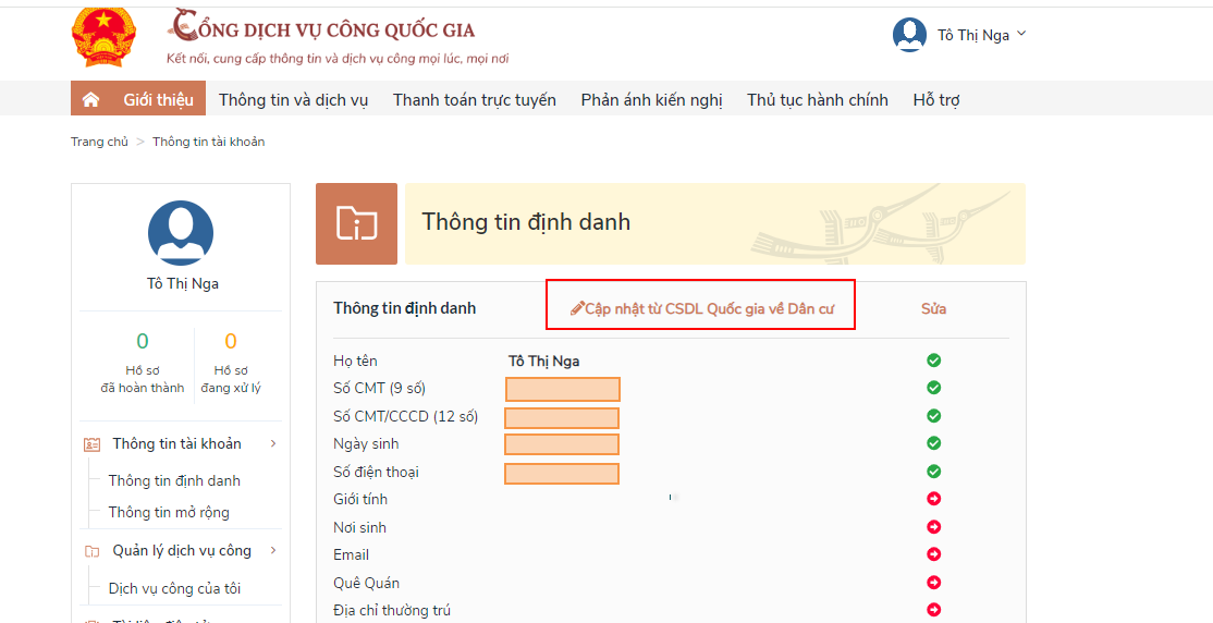 Công dân/cán bộ nhập số CCCD và chọn nút “Cập nhật”. Hệ thống điều hướng đến màn hình nghiệp vụ cần thực hiện với trạng thái Đã đăng nhập
